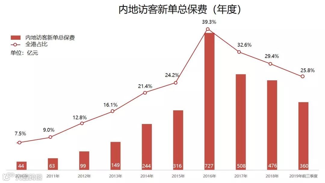 内地访客在2019年前三季度带来的新单保费高达360亿港币,依然占据着香港保险市场的重要份额,内地访客新造保单保费占个人业务总新造保单保费的25.8%!