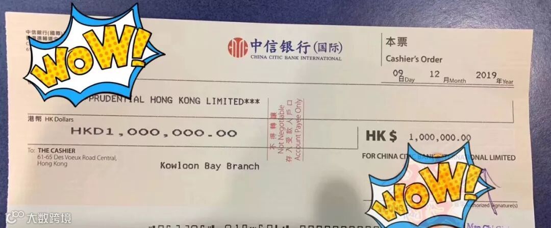 根据票面显示,这是2019年12月9日开具的给保诚PRU的一张缴费本票,金额为1000000港元。