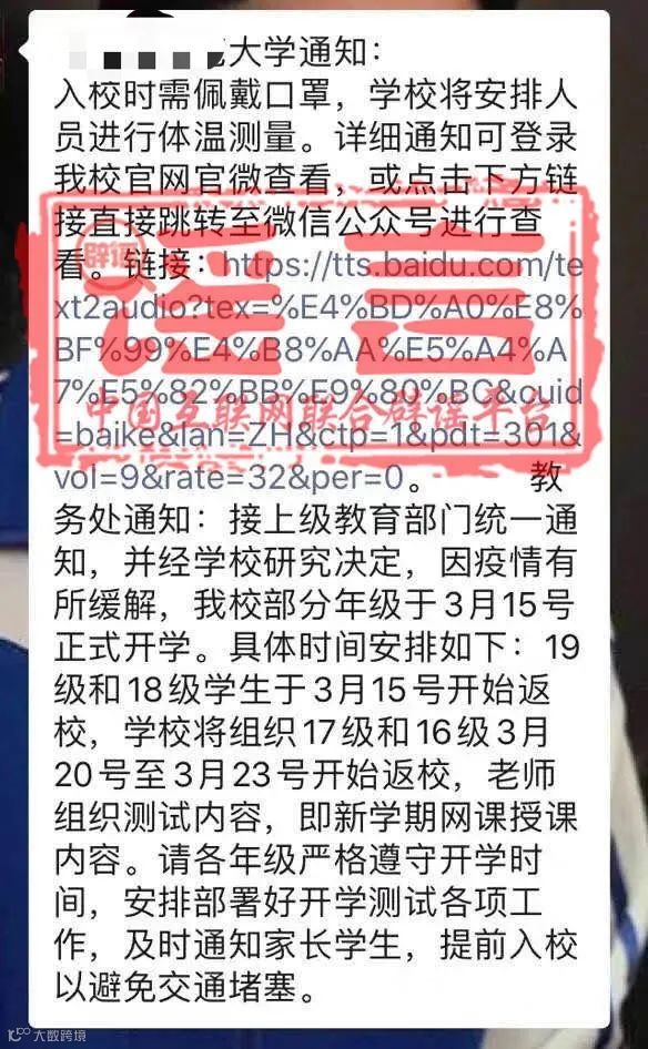 近日,一条冠名为某高校的“返校通知”在微信群大量传播,引发部分高校师生的关注和质疑。