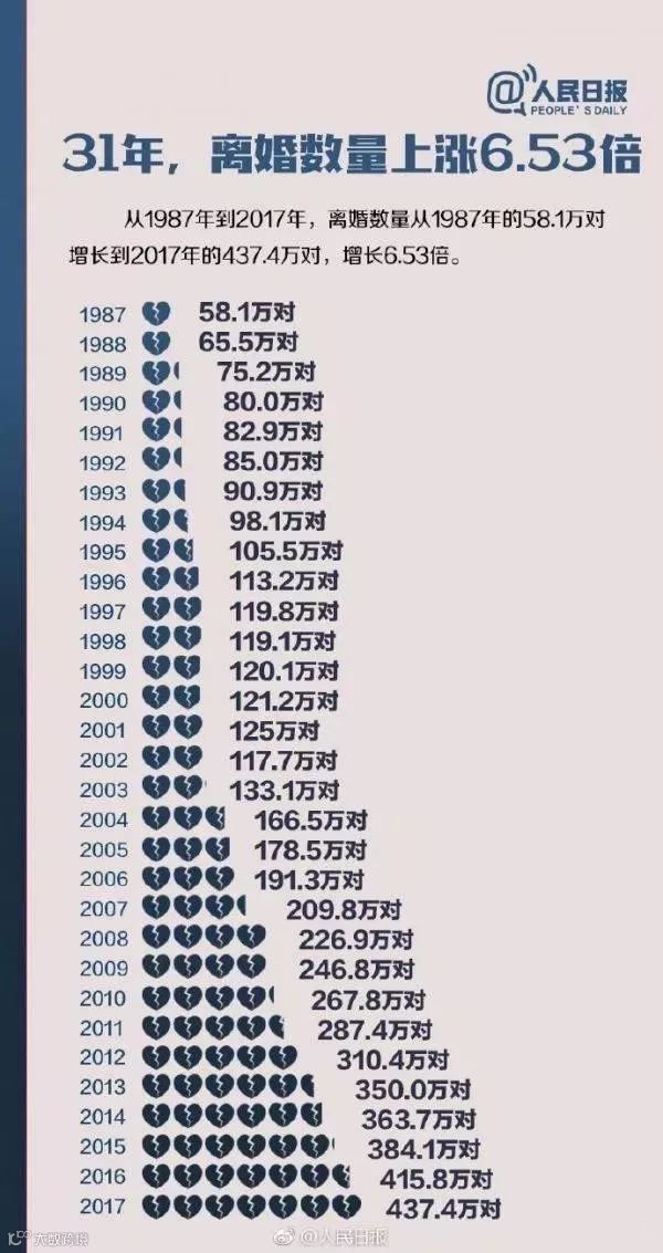 2018年4月,《人民日报》发表了一组数据:从1987年到2017年,离婚数量从58.1万对增长至437.4万对,增长6.53倍;离婚率由0.55‰上涨至3.2‰,并从2003年开始连续15年上涨。