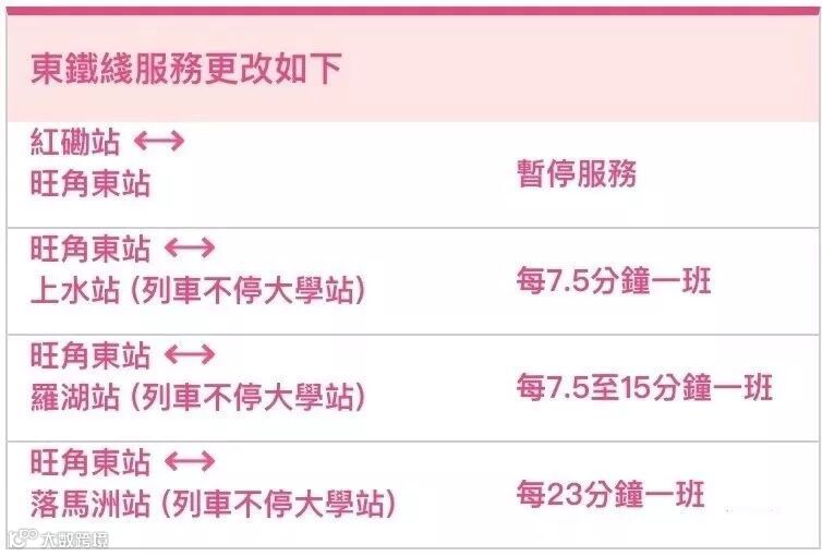 由头班车起,东铁线提供旺角东至罗湖/落马洲之间服务,不停大学站。港铁将安排免费接驳巴士于上午及下午繁忙时段来往大埔墟站至锦上路站。