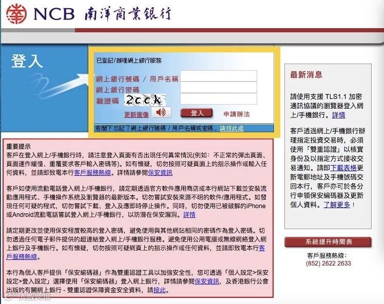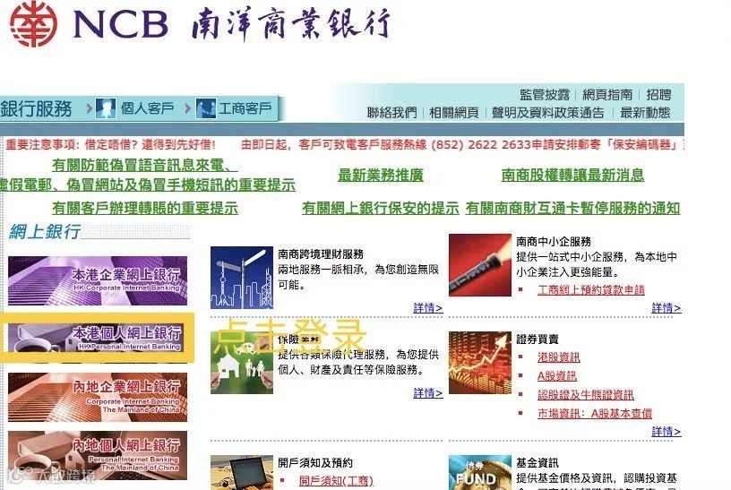 1. 登录南洋商业银行(香港)网站,打开电脑输入https://www.ncb.com.hk/,点击“本港个人网上银行”。