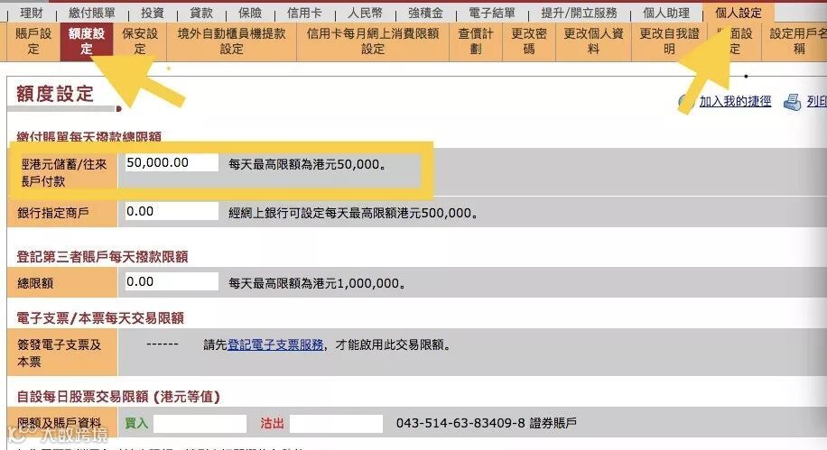 网银的菜单栏选择“个人设定” -- “额度设定”,把相应的数值设定一下。我这里设置的是等值50万港币的“银行指定商户”缴付账单每天额度。