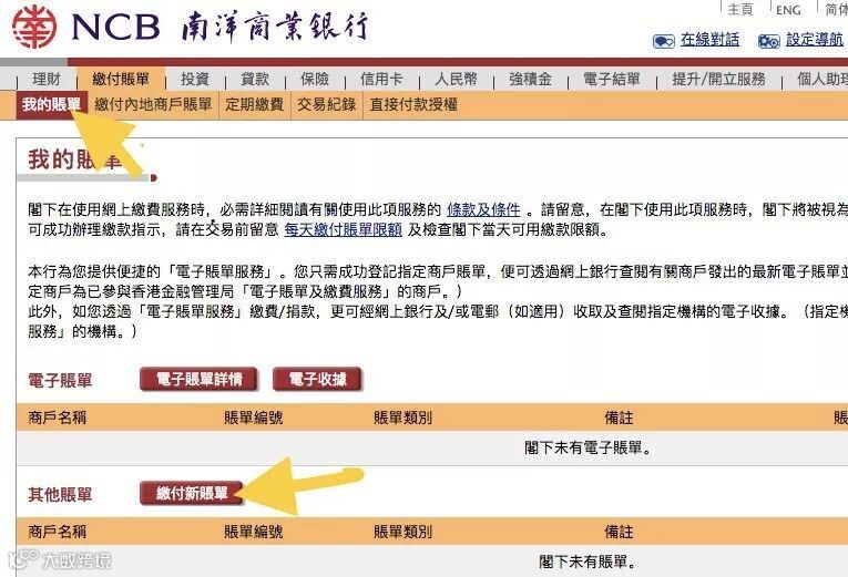 4、登入网银之后,会出现以下界面,选择"缴费账单",再点击“我的账单”:会出现以下界面,选择"缴费新账单":