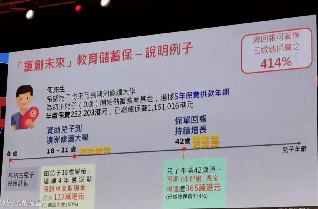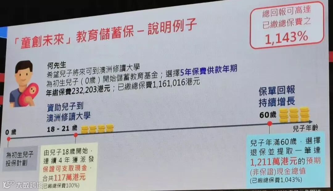 那么儿子大学4年,可以获得保证117万港币,而后孩子60岁,一次性退保可以获得1211万港币,总回报可高达已交总保费的1143%。