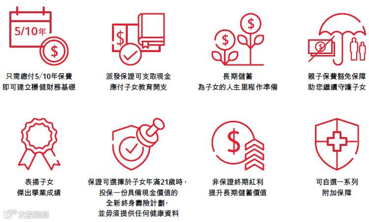5、加保选择权:子女21岁加保终身寿险,无需健康资料