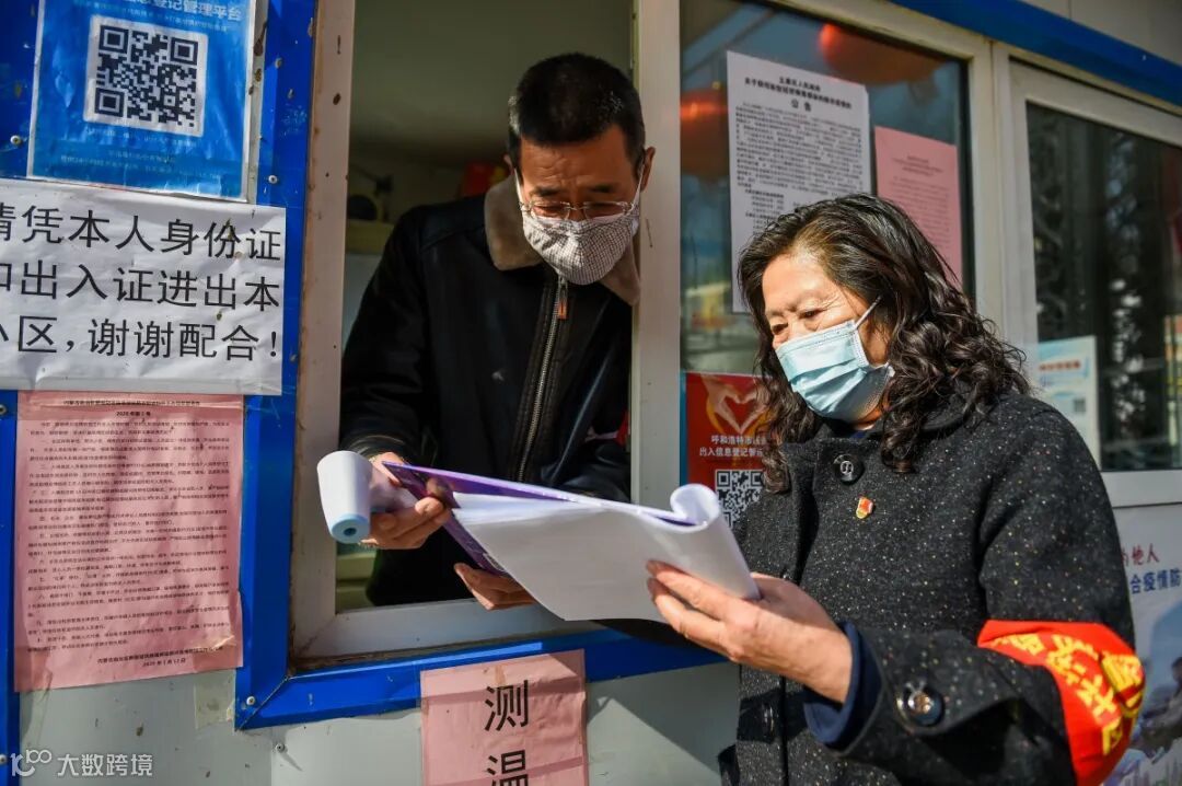3月5日,在呼和浩特市清泉街社区,武荷香(右)查看小区出入登记情况。