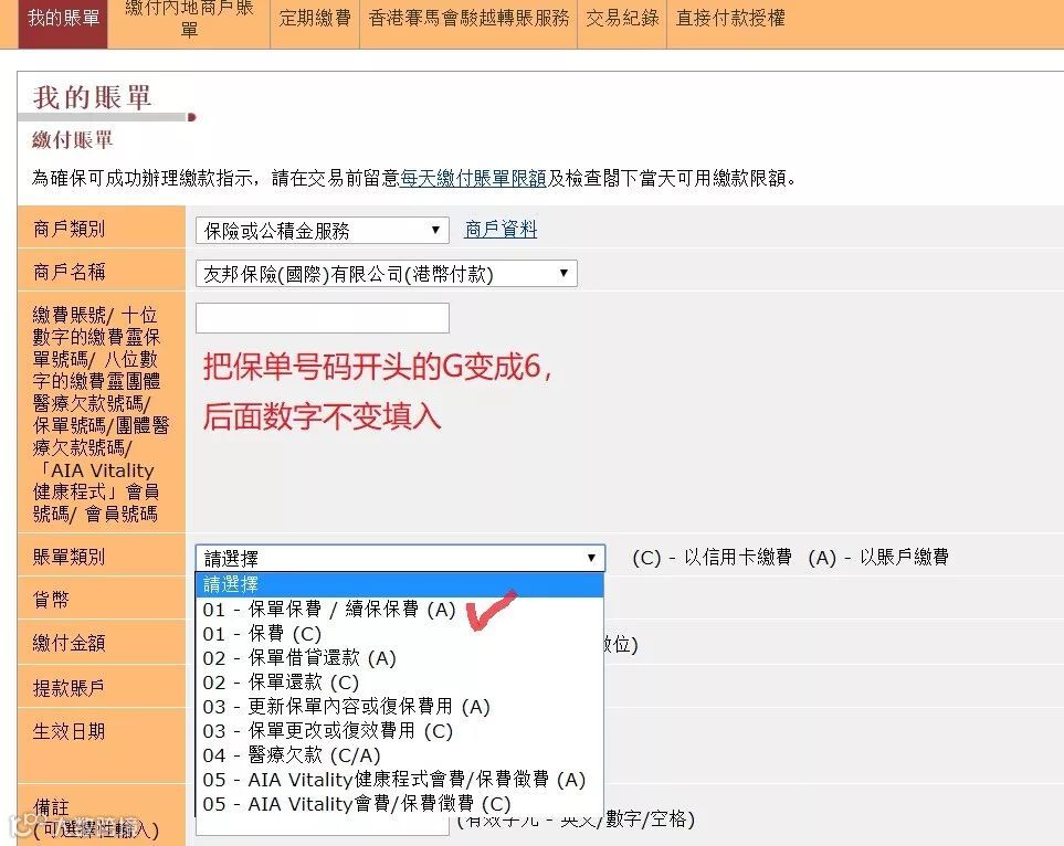随后选择“保险或公积金服务”,然后找到“友邦保险(国际)有限公司”,即我们友邦保险。中银可以选择用港币或美元进行账单缴付。选择相应的商户名称即可。
