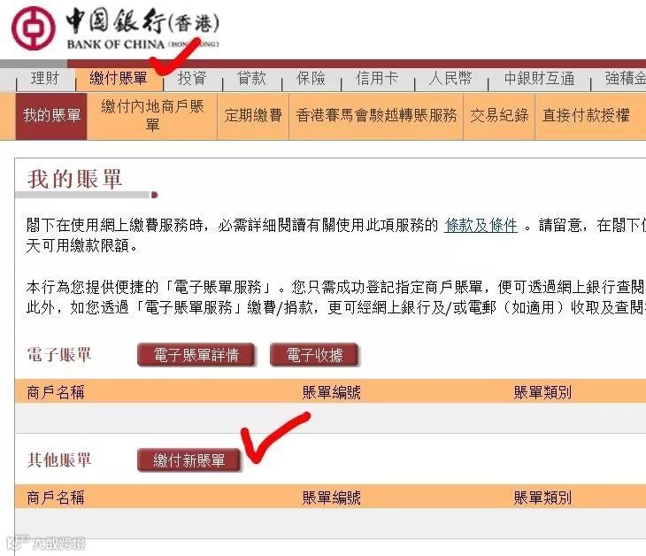 要缴纳友邦的保费,可以使用“缴付账单”的功能,如下图所示,点击“缴付新账单”。