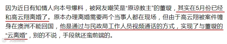 因为高云翔目前无法离境澳洲,SO高云翔选择与民政局工作人员视频通话的方式,视频离婚!最终才实现了与董璇的“云离婚”…