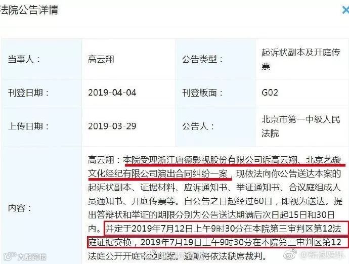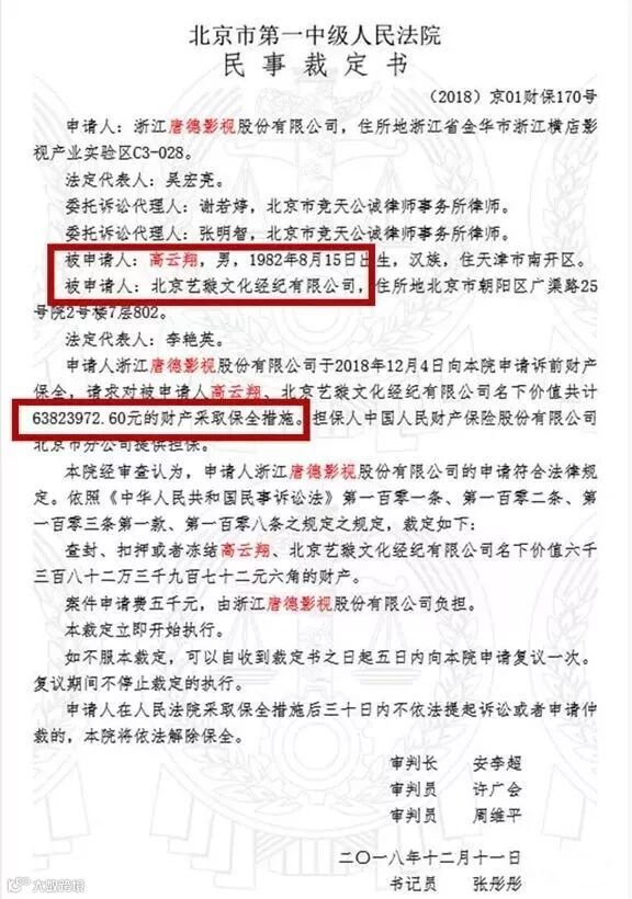2019年1月份的时候,中国裁判文书网上公示了一则《诉前财产保全民事裁定书》。作为申请人的唐德影视要求法院针对被申请人高云翔和北京艺璇文化经纪有限公司名下价值6300万余元的财产进行查封、扣押或者冻结,法院裁定立即执行上述裁判结果。