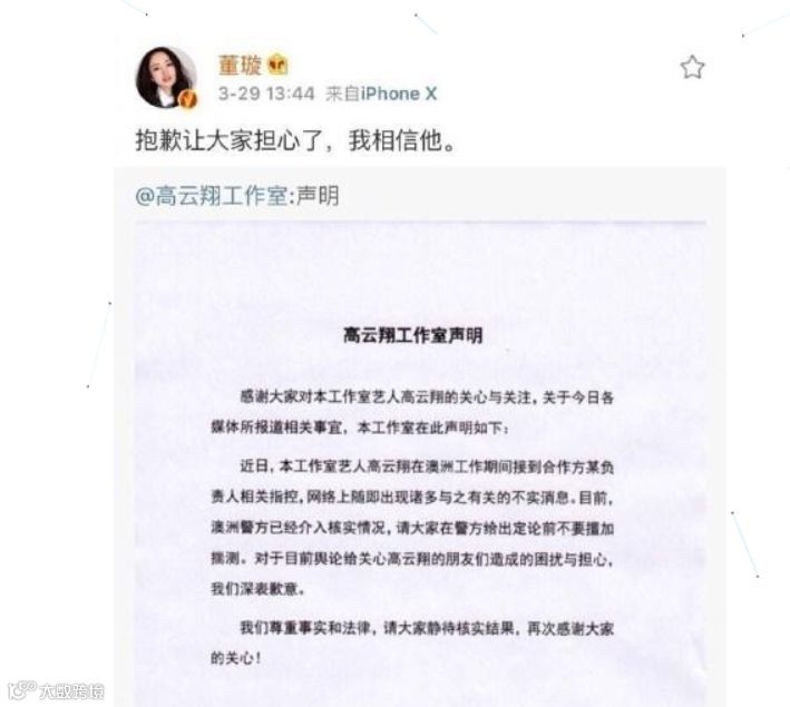 而且董璇本人今年3月29日曾转发过一条高云翔发的声明,