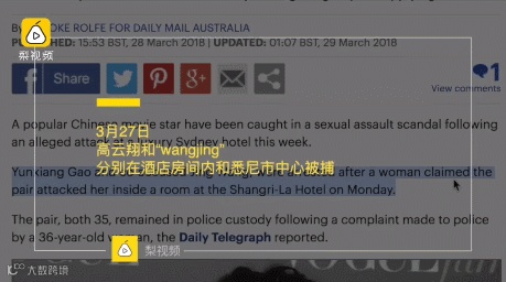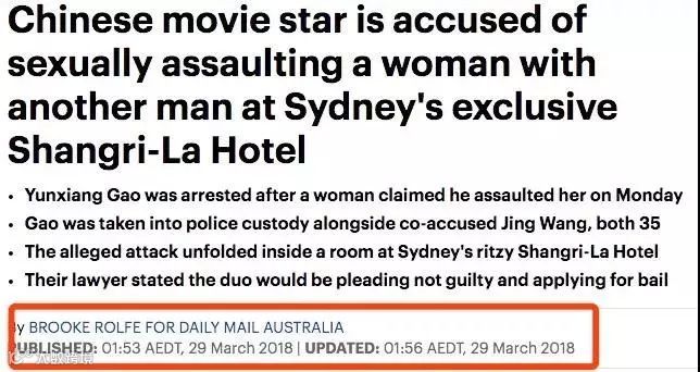 2018年3月29日,身处澳大利亚拍摄影视作品的中国男星高云翔。遭到指控,指控其在悉尼著名环形码头香格里拉酒店内对一名女子实施性侵。