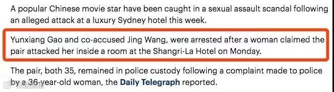 据英国媒体《每日邮报》发来的报道,这名报警女子坚称,本周一,她与高云翔和Jing Wang两名被告男子进入悉尼环形码头的香格里拉酒店房间内,并表示,两名男子同时对其进行性侵。