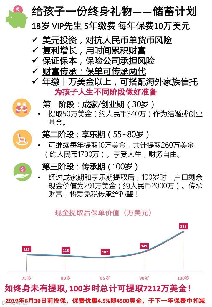 无法确定后期孩子们在欧美继续工作生活还是回国,但大部分家庭原有的资产配置主要是在中国,升级版本建议多加一份储蓄型保险。五年或者十年的缴费,为孩子的未来结婚/创业,为自己的环球养老储备资金。对于资金比较充裕的家庭,可以选择年缴10万美金以上,可以免成立费搭配海外保险金信托。保险金信托的方式,可以更加自由的确定日后的传承计划。