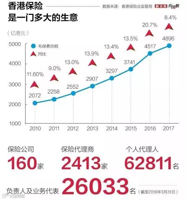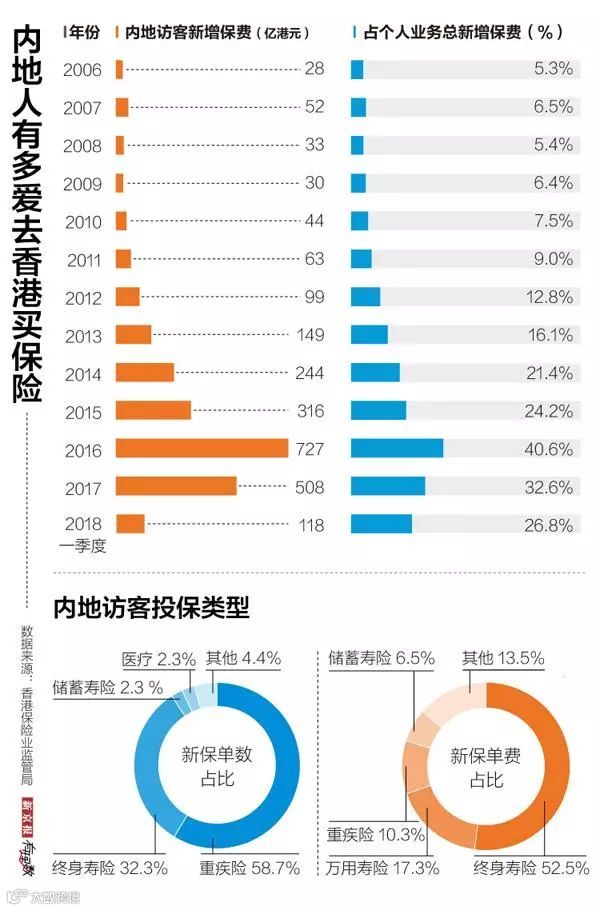 那一年,内地朋友来香港买保险的总额仅18亿港元,占当时个人购买保险的5%。而次年(即2006年),内地朋友来香港买保险的总额增加了10亿港元至28亿港元。到了2016年,内地朋友购买保险的总额高达727亿港元。