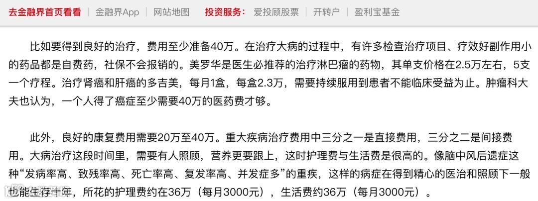 此外,要想得到良好的治疗,费用至少准备40万。在治疗大病的过程中,有许多检查治疗项目、疗效好副作用小的药品都是自费药,社保不会报销的。肿瘤科大夫认为,一个人得了癌症至少需要40万的医药费才够。除此之外,还有良好的康复费用需要20万至40万。也就是整个治疗费下来,至少要准备好100万!