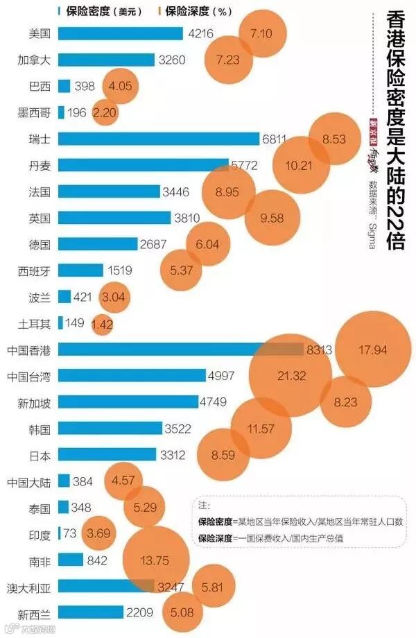 根据瑞士再保险公司Sigma的报告,2017年香港地区的保险密度高达8313美元/人,在亚洲排名第一。保险深度约为17.94%,在亚洲排名第二。