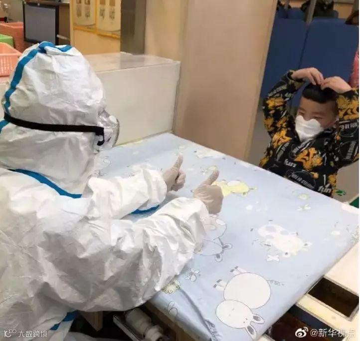 穿着防护服,说话不方便,看着眼前可爱的孩子,鲍翠芳双手竖起了大拇指回应。