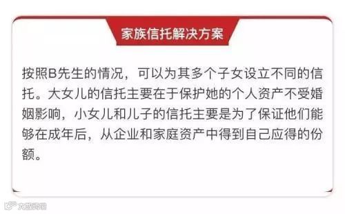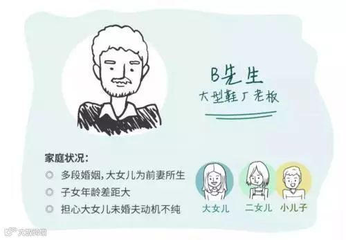B先生是当地最大的鞋厂的老板,企业稳定盈利情况良好。B先生曾离过婚,22岁的大女儿是前妻所生,8岁的二女儿与3岁的小儿子是现在的B太太所生。B先生离婚时大女儿已经懂事,对现在的B太太有些排斥。
