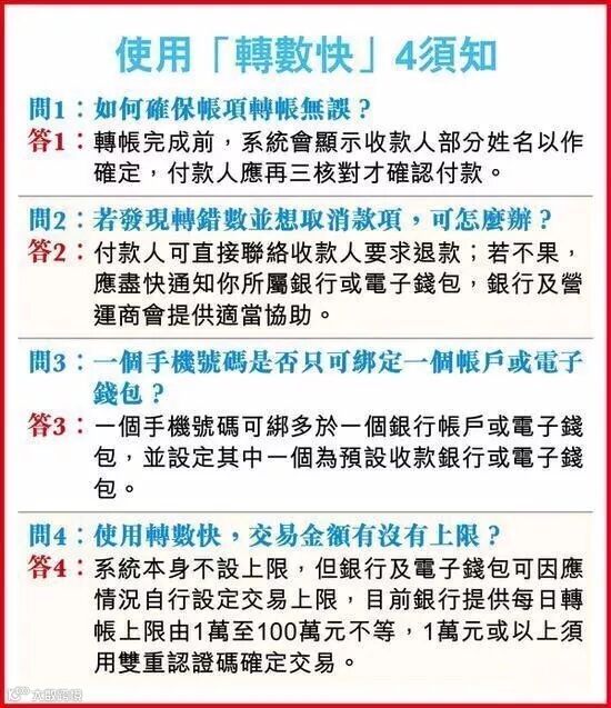 由于“转数快”的定位是一个「小额实时支付平台」,因此每日转账有上限,个人对个人1万港币。(中银、星展等银行每日转账上限高达100万港币,但需双重认证)