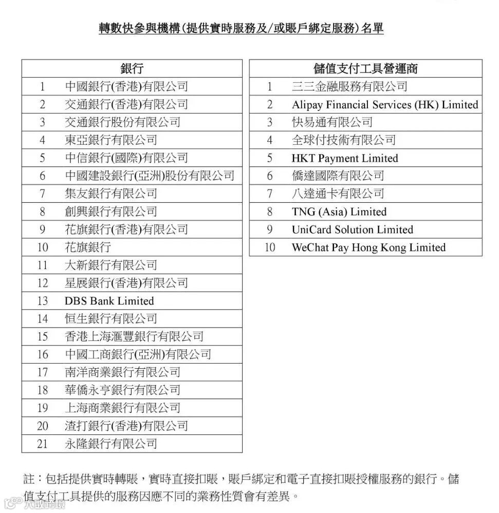 香港金管局称,目前有21家银行(包括大部分零售银行)及10家储值支付工具营运商参与了“转数快”系统。“市民今日开始可以通过参与银行及储值支付工具营运商的手机程式在“转数快”登记手机号码或电邮地址作爲收款账户代码。从9月30日开始,市民可使用’转数快’转帐、支付和收款。”