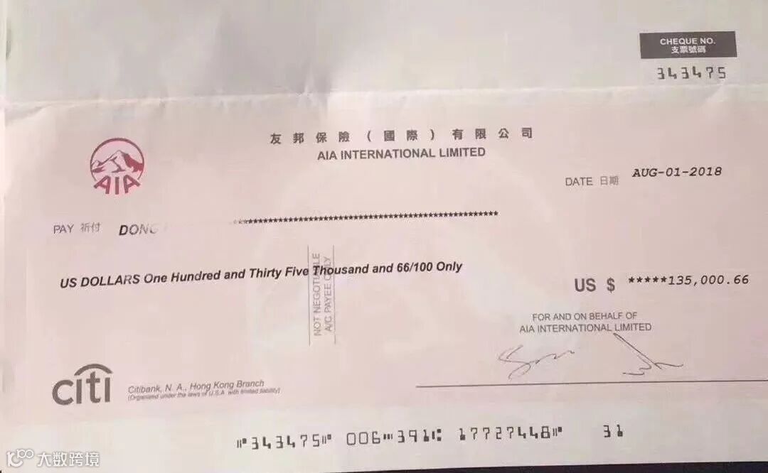 董先生DONG XXX每年保费2319美金,共交了2次,交了保费4638美金,本次理赔款135000美金,约925000人民币,是已付保费的30倍,为一次性赔付。