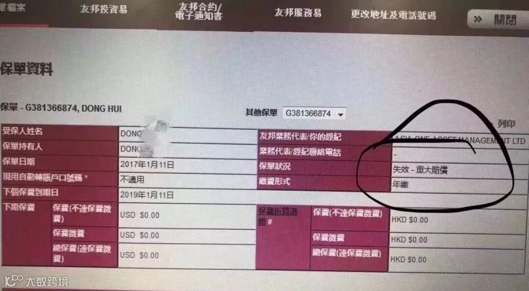 打开看了一下,原来董先生DONG XXX是2017年1月11日购买了友邦【加裕倍安保】的客户(一次性赔付产品,已停售),目前该款产品已经升级为【加裕智倍保】,多次赔付,大家知道一下。