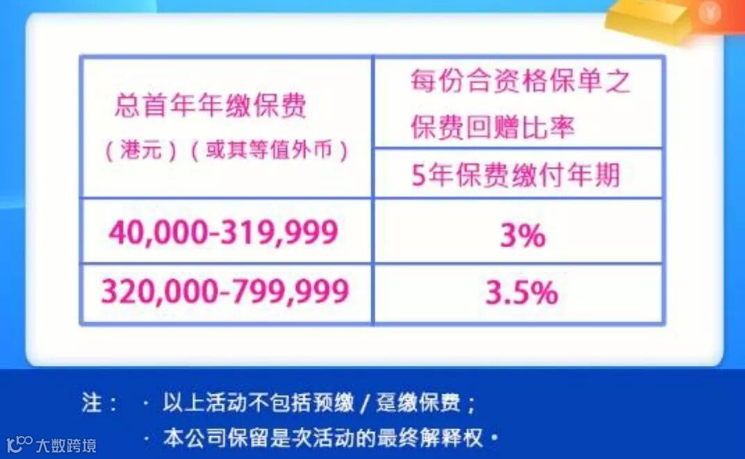 在推广期内,客户成功投保全新安进储蓄计划,而每份该基本计划及其附加契约的首年年缴保费符合下表要求,每份合资格保单即有机会获享高达3.5%保费回赠。
