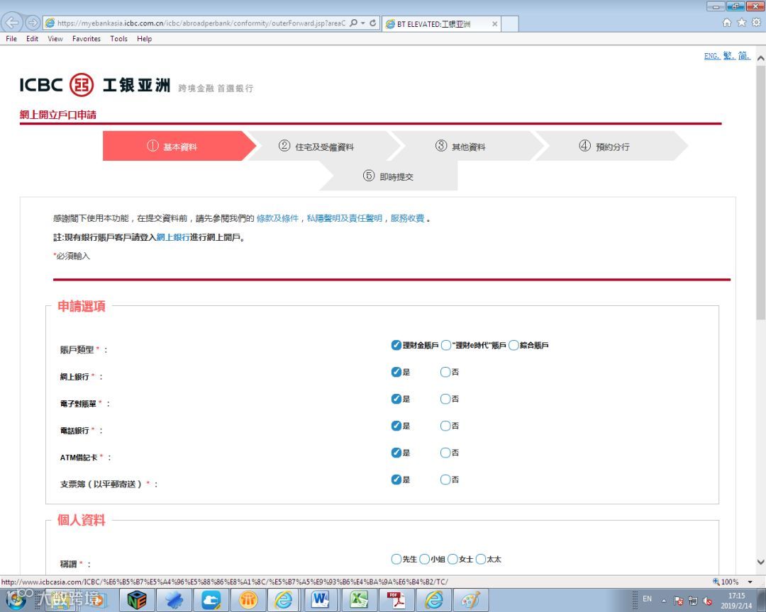 3、填写个人“基本资料”、“住宅及受雇资料”和“其他资料”等。