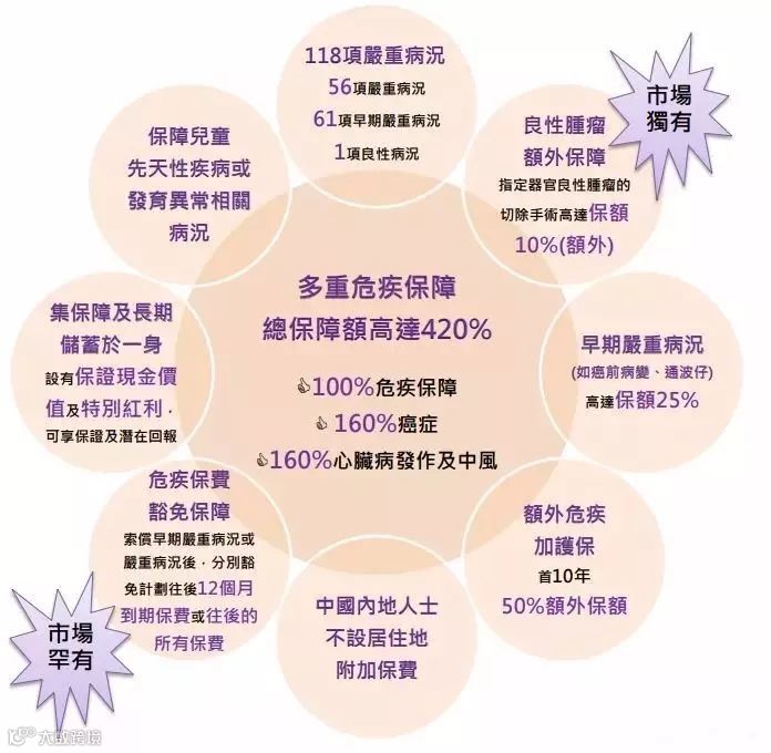 多重赔偿:一次重大疾病+两次癌症+两次心脏病/中风(共500%的保额);