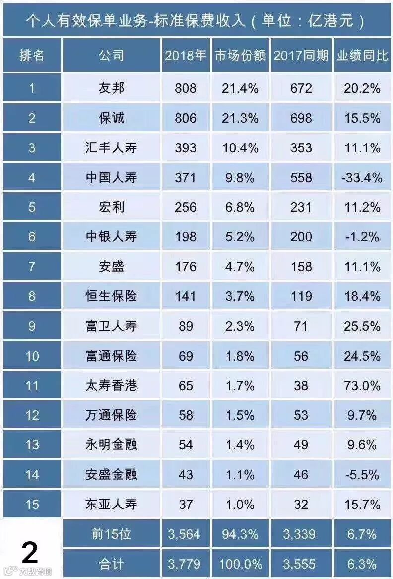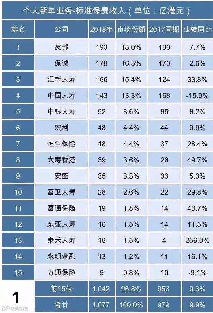 一、个人新单业务标准保费(年化保费+整付保费*10%),排名前四的公司分别为友邦、保诚、汇丰人寿和中国人寿海外。