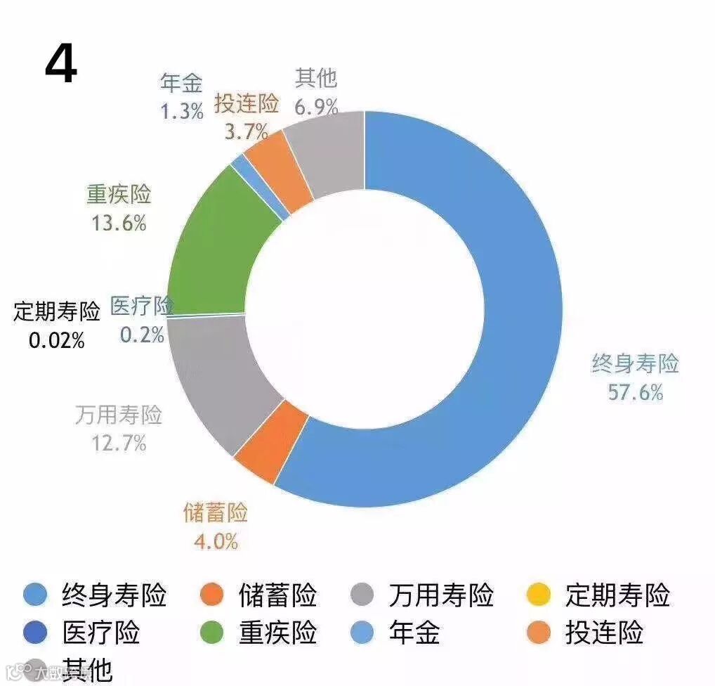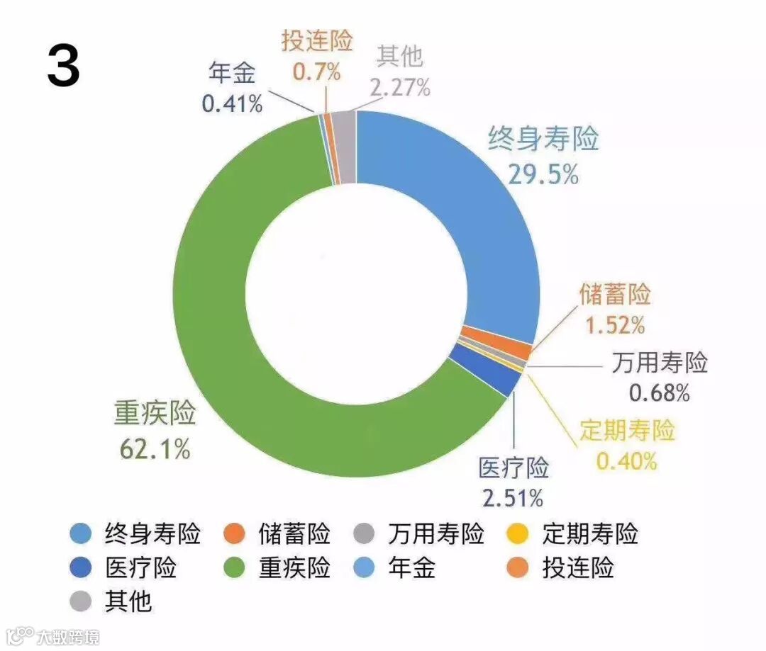 三、新单保单数统计,内地访客购买重疾险的数量最多,持续上升,2018年占比为62.1%,远高于2017年,展现出香港重疾险对内地访客较强的吸引力;其次为终身寿险,占比29.5%,较2017年同期有明显下降。