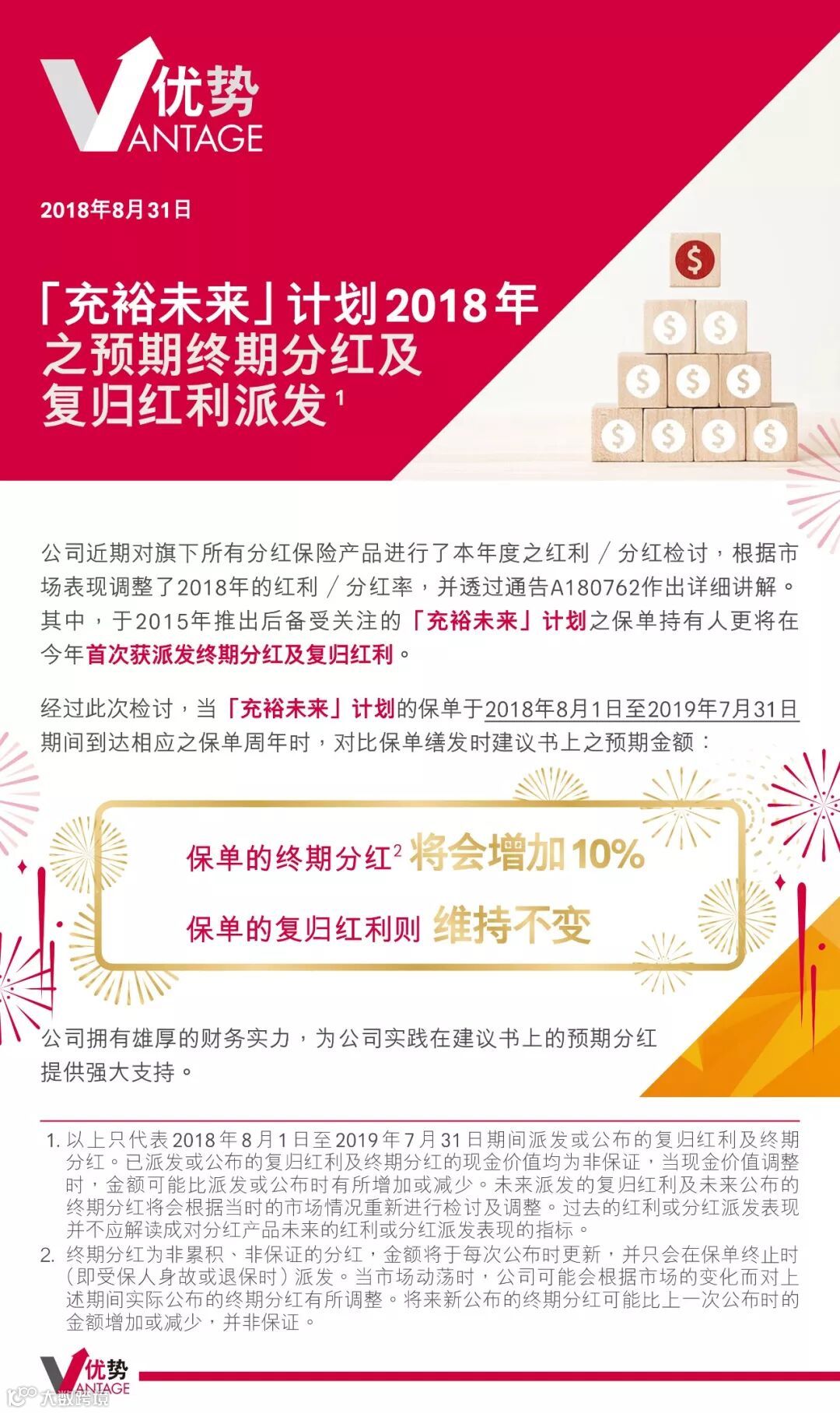 友邦第一时间发布其旗下王牌储蓄产品—充裕未来的预期分红,在保持复归红利不变的情况下,保单的终期分红将增加10%。一路以来,很多客户对香港友邦保单派发红利的实际情况特别关心,这次友邦给广大客户一颗大大的定心丸!