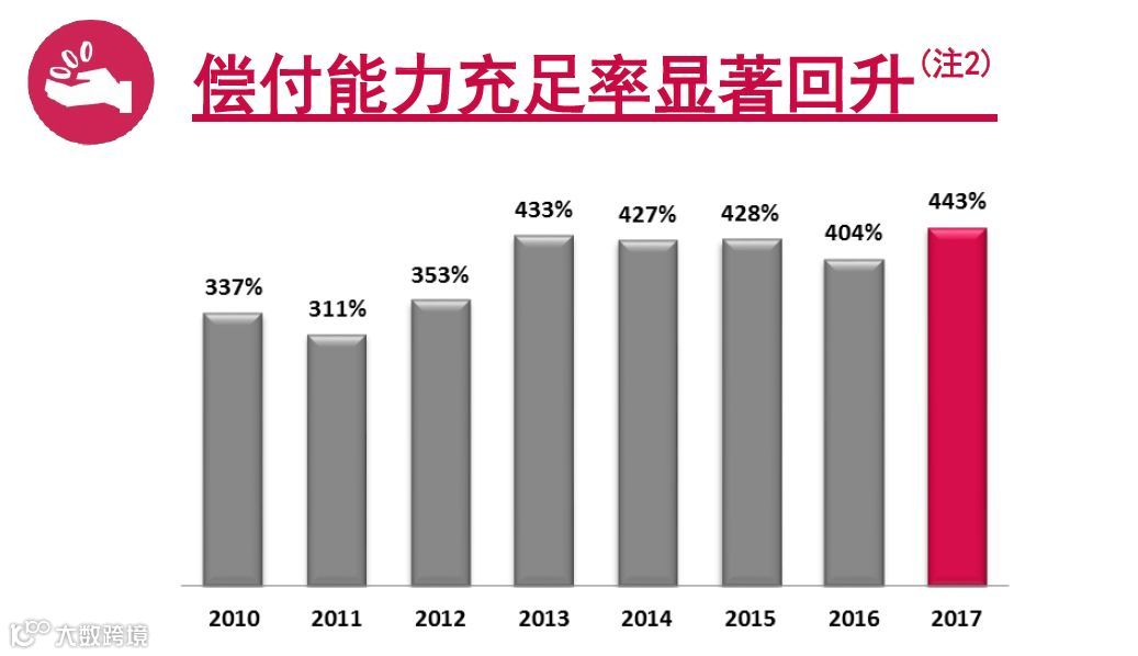 友邦保险有限公司(AIA Co.)的偿付能力充足率曾因 2016 年增持印度 Tata AIA Life Insurance Company Limited 的股权而下调至 404%,但截至 2017 年 11 月 30 日已回升至443%(注3),并创历史新高。