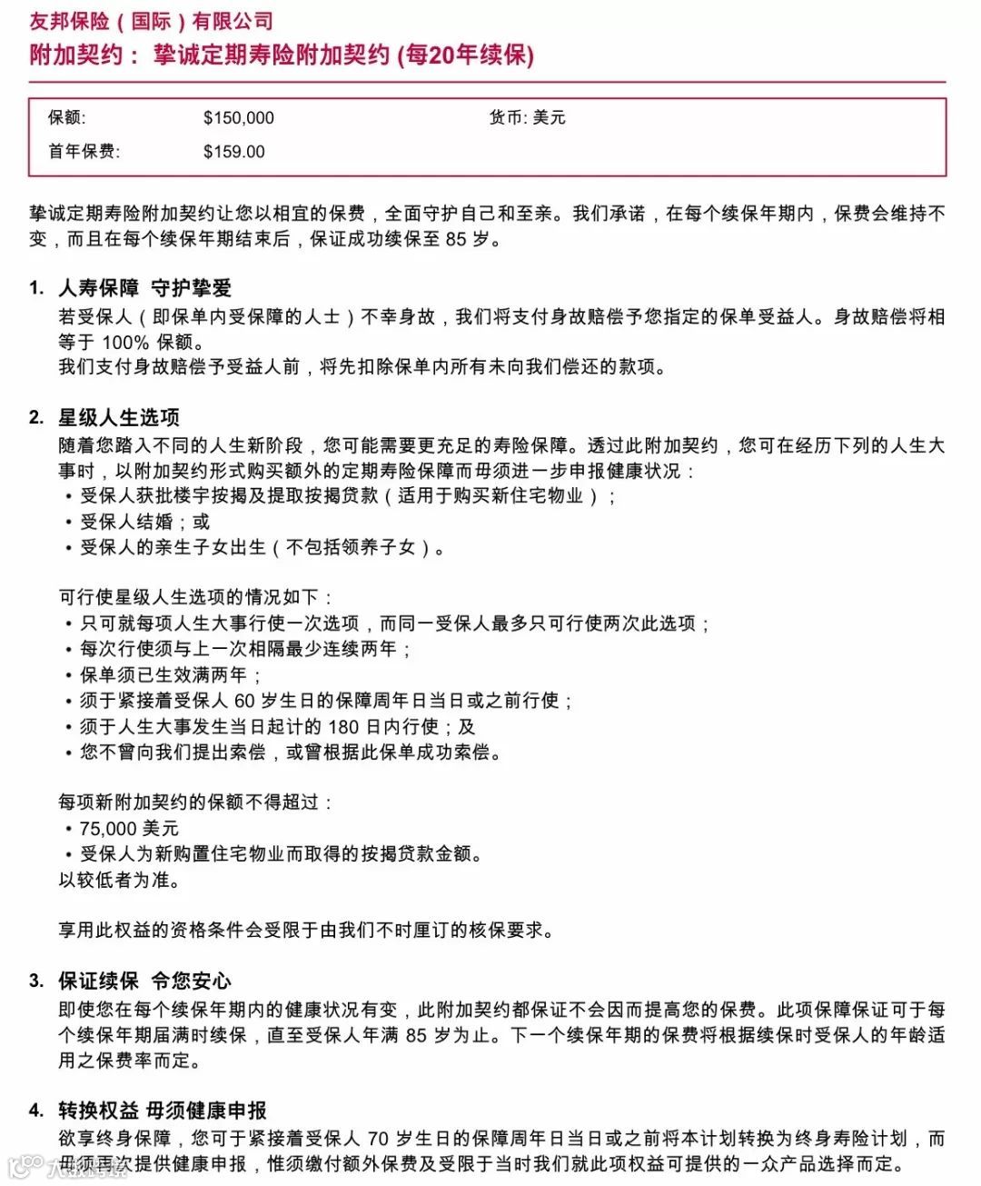 星级人生选项:在被保险人获批楼宇按揭、结婚、生子时,可行使“免体检加保”权利,加保保额不得超过原保额的一半或50万美金(两者取小);