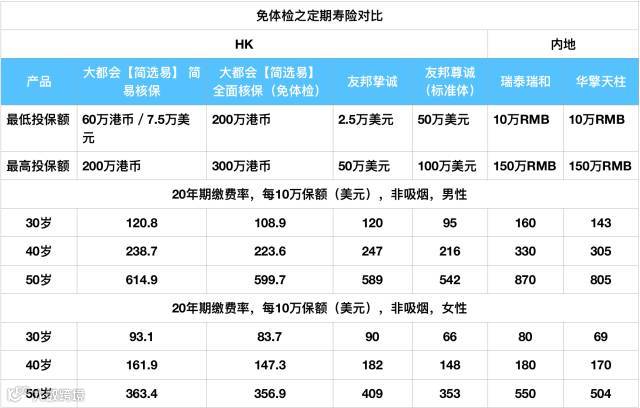 大都会【简选易】定期寿险:大都会是美国最大的保险公司之一,在香港排名第十位左右,近几年开始主攻内地市场。产品根据投保额与被保险人的身体状况(虽然免体检,但是“全面核保”对于健康状况的要求更高)分为两档,费率适中,可购买保额弹性较大,内地居民可直接作为主险购买,是我目前见到的对内地居民最有诚意的一款定期寿险产品。