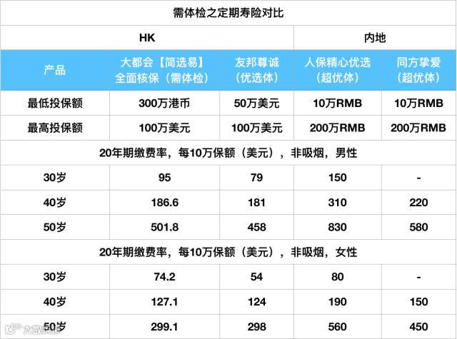大都会简选定期寿险:大都会简选的全面核保(需体检)的费率略高,不过保额的选择更为灵活,可投保300万港币至100万美元(约800万港币)之间的保额。