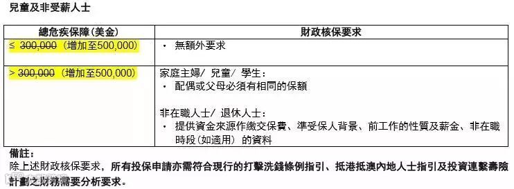 而抵港抵澳内地人士(儿童及无工作人士)投保危疾类产品财政核保要求从30万美金保额提高到50万美金保额。