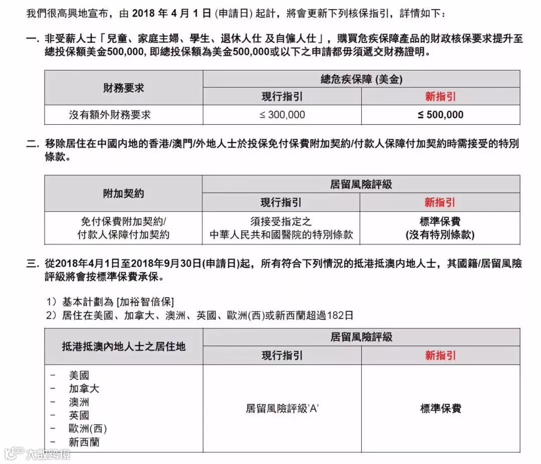 自2018年4月1日起:抵港抵澳内地人士(有工作)投保危疾类产品财政核保要求从50万美金保额提高到75万美金保额。