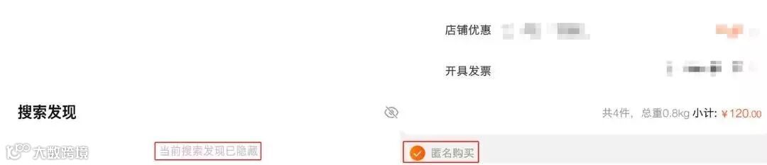2.以“手机淘宝”为例,在提交订单后留心查看并开启“匿名购买”功能,在搜索发现商品中可点击右上角图标开启“隐藏搜索记录”等功能保护个人信息。