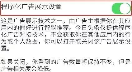 1.以“今日头条”为例,点击【我的】-【系统设置】-【广告设置】-【程序化广告展示设置】,开启后看到的广告数量不会少,但广告的精准程度将会降低;