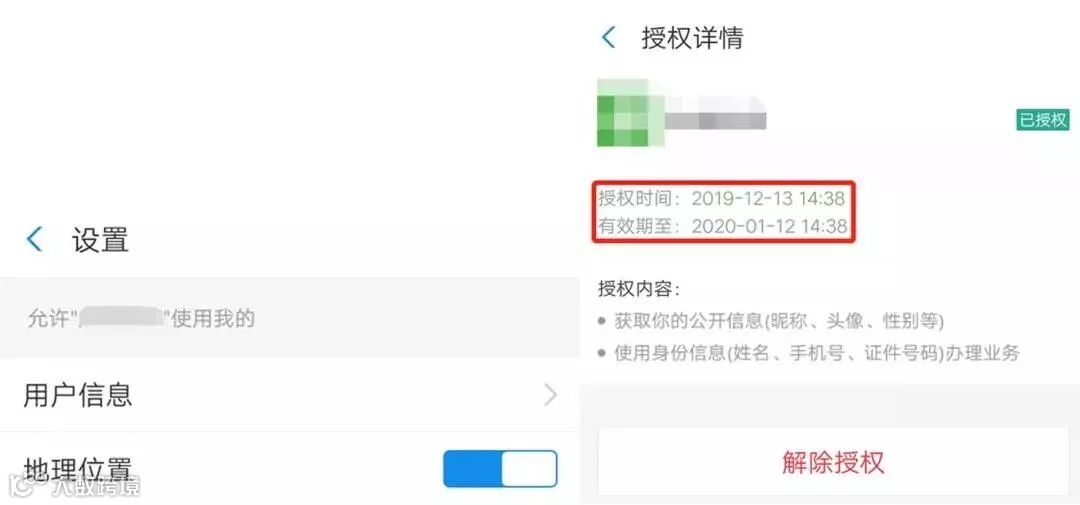 2.以“支付宝”为例,提供了默认授权小程序一个月内有效的使用时长,可以通过小程序右上角的“关于”、“设置”中,撤回用户信息或相应权限的授权。