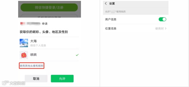 1.以“微信”为例,提供了在授权小程序账号登录时的用户身份标识项,避免个人信息被二次收集,强烈建议选用可替代的、临时有效的登录方式,同时在小程序右上角中的设置选项中管理个人信息,防止基于昵称、头像等方式的追踪行为;