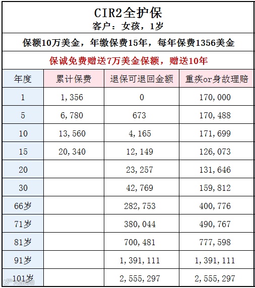 * 以上为例,1岁女孩年缴仅1356元,保额即达17万!15年总保费2万,万一中途全额理赔,后面的钱都不需要再交。还有一笔妥妥的退休金。