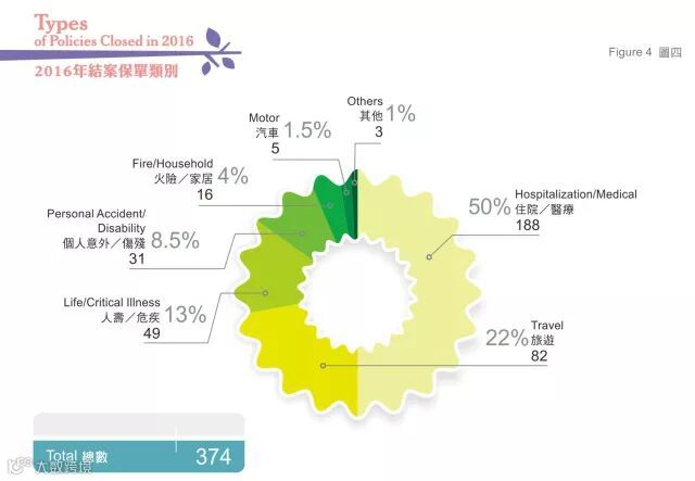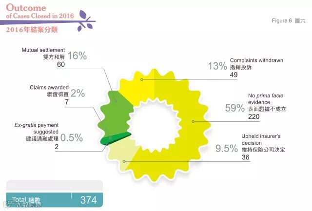 此外,根据保险投诉局最新的年度报告显示,该局于2016年受理494宗投诉个案(总接获个案770宗) 中,376宗已经审结。当中住院/医疗约50%,而人寿/危病亦达13%。其中保单条款诠释、不保事项及没有披露事实佔超过半数。
