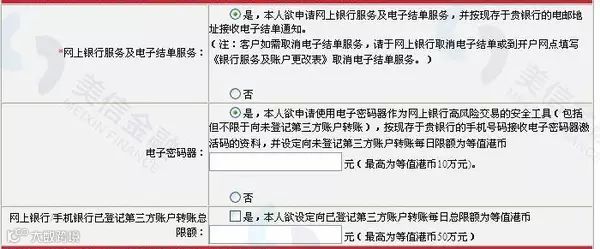 “电子密码器”,建议勾选“是”,并且填写您希望的转账额度(最高10万港币),给未登记第三方账户;