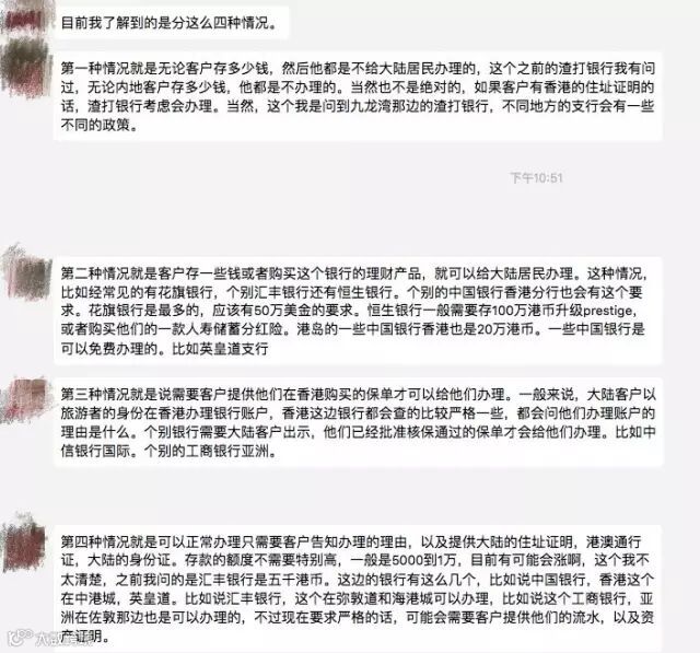 我特别咨询了一位经常带客户到香港办卡的朋友,下面这张图是他半个月前亲自验证过的情况,信息满满: