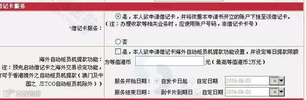 “借记卡服务”,如果勾选“是”,则工银亚洲两周后会寄您一张工银亚洲的借记卡,可以在香港ATM机上使用;也可以勾选“否”;