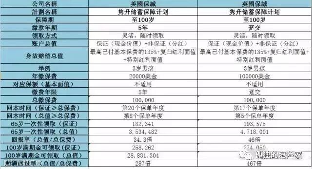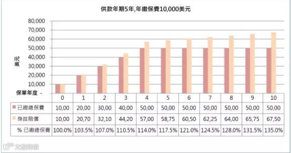 我们以 2万美金一年五年缴和10万美金趸交做了一个比较: